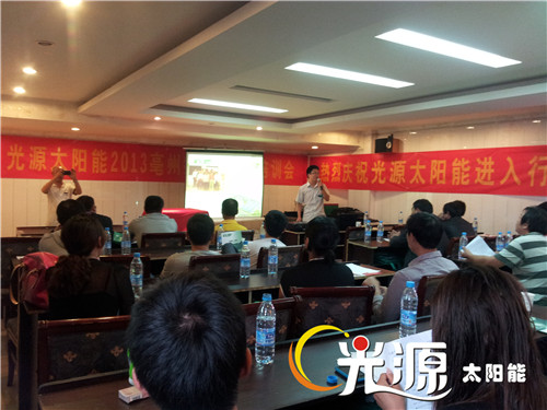 9月12日,光源太陽能安徽亳州招商會成功舉行。會場擺放了光源樣機,整潔美觀的外形,結實耐用的支架及合理的產品設計,得到與會經銷商的贊揚。