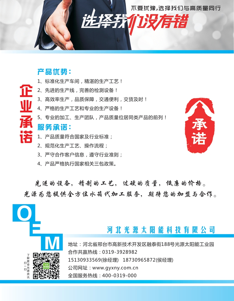謙尊而光,酌水知源。前行中的光源太陽能,感恩客戶,固本創(chuàng)新,以振興民族太陽能光熱產(chǎn)業(yè)為己任,將“打造太陽能世界品牌”作為企業(yè)發(fā)展目標,高歌奮進,光耀東方!