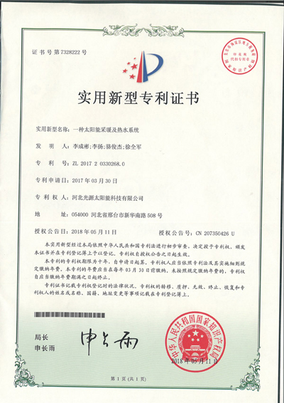 實用新型專利證書--一種太陽能采暖及熱水系統(2)